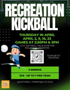 Join us for Thursday afternoon kickball at the LCCC Softball Field (or in the gym if the weather doesn’t cooperate)! Games will be held on April 2, 9, 16, and 23 at 2:30 PM and 3:00 PM.