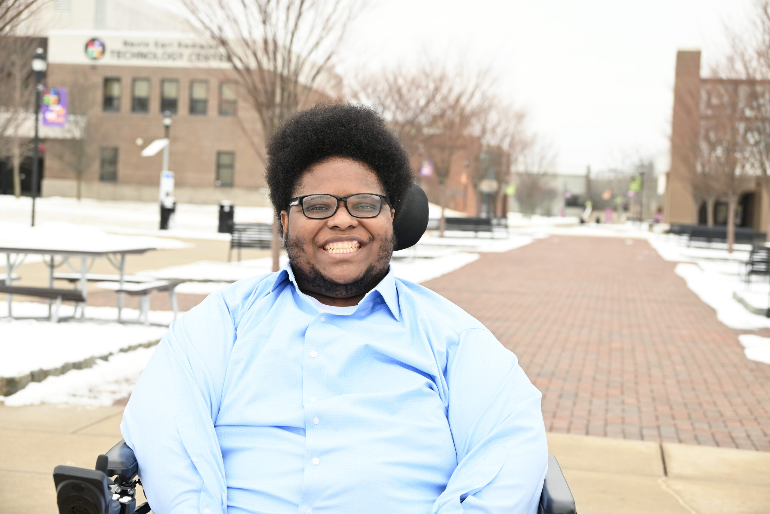 Isaiah Natale smiles and poses for a photo on the outdoor mall area at Main Campus.After several changes of major, Natale landed on communication in an effort to improve his public speaking skills for his career path, a choice that was due in large part to the influence of his mentor. Ant, a family friend and a fellow chair-user, encouraged Natale to nurture his desire to share his story of overcoming seemingly impossible adversity. “Him believing in me and taking that risk to help me get started meant so much to me,” he says. “I want to inspire others through motivational speaking.”