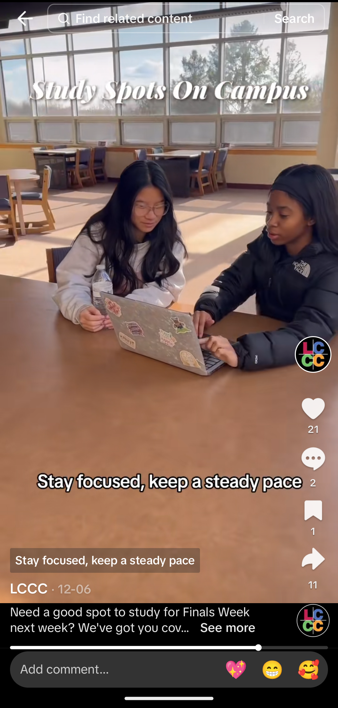 “This program benefits the students,” Melin says. “Additionally, our social media has become more authentic by incorporating even more student voices, which impacts our department’s efforts to boost enrollment and student registration.” Both the students and College Relations and Student Life work together to create content that fits the overall goal of LCCC’s social media and stays true to the students who develop it.