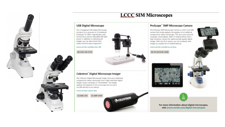 Our program also has an assortment of microscopes and prepared slides that can be used to “get a closer” look at science. These can be used either by the students to explore the hidden world or demonstrated by the instructor by projecting images onto whiteboard while discussing the features and structure of specimens form plants, animals and minerals. Check out the options below at the LCCC SIM Microscopes and Slides inventory.